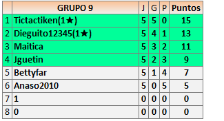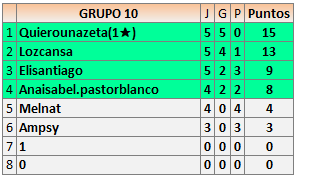 Deja un comentarioEn está página se irán publicando los resultados de las diferentes partidas, siendo ambos jugadores responsables de subirlos o de comprobar que ya hayan sido publicados insertando un COMENTARIO en la parte inferior de la pantalla (opción “Deja tu comentario”), indicando el nombre de los dos jugadores y los puntos obtenidos en la partida.