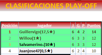 Mi torneo individual ( contando los tir, match y estrategia, o sea, ls que constan de fases, cruces y playoff) número 11 igualando en la cabeza a Adrian, seguidos por Carlosguey con 10, heisenberg y shield con 9 , thecrow y eloyvega con 7.