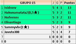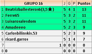 Deja un comentarioEn está página se irán publicando los resultados de las diferentes partidas, siendo ambos jugadores responsables de subirlos o de comprobar que ya hayan sido publicados insertando un COMENTARIO en la parte inferior de la pantalla (opción “Deja tu comentario”), indicando el nombre de los dos jugadores y los puntos obtenidos en la partida.