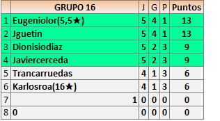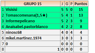 Deja un comentarioEn está página se irán publicando los resultados de las diferentes partidas, siendo ambos jugadores responsables de subirlos o de comprobar que ya hayan sido publicados insertando un COMENTARIO en la parte inferior de la pantalla (opción “Deja tu comentario”), indicando el nombre de los dos jugadores y los puntos obtenidos en la partida.