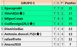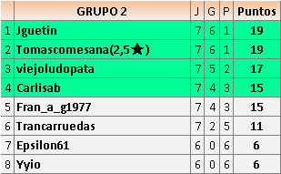 Deja un comentarioEn está página se irán publicando los resultados de las diferentes partidas, siendo ambos jugadores responsables de subirlos o de comprobar que ya hayan sido publicados insertando un COMENTARIO en la parte inferior de la pantalla (opción “Deja tu comentario”), indicando el nombre de los dos jugadores y los puntos obtenidos en la partida.