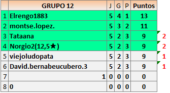 Deja un comentarioEn está página se irán publicando los resultados de las diferentes partidas, siendo ambos jugadores responsables de subirlos o de comprobar que ya hayan sido publicados insertando un COMENTARIO en la parte inferior de la pantalla (opción “Deja tu comentario”), indicando el nombre de los dos jugadores y los puntos obtenidos en la partida.