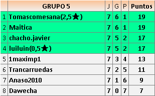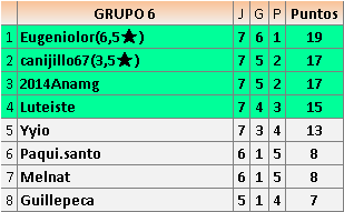 Deja un comentarioEn está página se irán publicando los resultados de las diferentes partidas, siendo ambos jugadores responsables de subirlos o de comprobar que ya hayan sido publicados insertando un COMENTARIO en la parte inferior de la pantalla (opción “Deja tu comentario”), indicando el nombre de los dos jugadores y los puntos obtenidos en la partida.