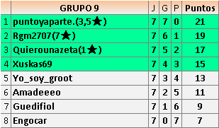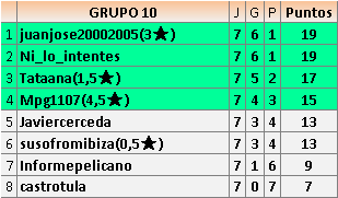 Deja un comentarioEn está página se irán publicando los resultados de las diferentes partidas, siendo ambos jugadores responsables de subirlos o de comprobar que ya hayan sido publicados insertando un COMENTARIO en la parte inferior de la pantalla (opción “Deja tu comentario”), indicando el nombre de los dos jugadores y los puntos obtenidos en la partida.