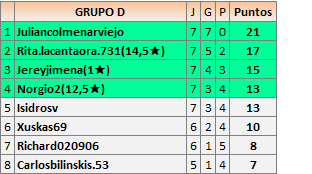 Deja un comentarioEn está página se irán publicando los resultados de las diferentes partidas, siendo ambos jugadores responsables de subirlos o de comprobar que ya hayan sido publicados insertando un COMENTARIO en la parte inferior de la pantalla (opción “Deja tu comentario”), indicando el nombre de los dos jugadores y los puntos obtenidos en la partida.