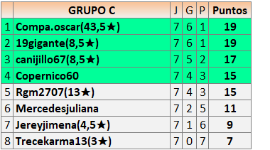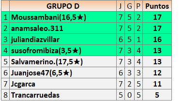 Deja un comentarioEn está página se irán publicando los resultados de las diferentes partidas, siendo ambos jugadores responsables de subirlos o de comprobar que ya hayan sido publicados insertando un COMENTARIO en la parte inferior de la pantalla (opción “Deja tu comentario”), indicando el nombre de los dos jugadores y los puntos obtenidos en la partida.
