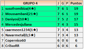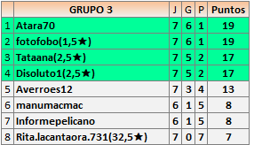 Deja un comentarioEn está página se irán publicando los resultados de las diferentes partidas, siendo ambos jugadores responsables de subirlos o de comprobar que ya hayan sido publicados insertando un COMENTARIO en la parte inferior de la pantalla (opción “Deja tu comentario”), indicando el nombre de los dos jugadores y los puntos obtenidos en la partida.