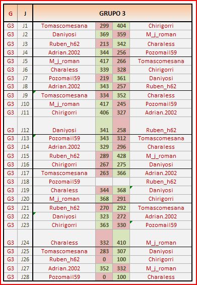 Deja un comentarioEn está página se irán publicando los resultados de las diferentes partidas, siendo ambos jugadores los responsables de subirlos, o comprobando que ya hayan sido subidos, insertando un COMENTARIO en la parte inferior de la pantalla (opción “Deja tu comentario“), indicando el nombre de los dos jugadores y los puntos obtenidos en la partida.