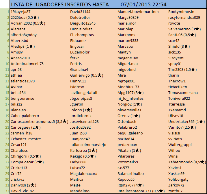 «Las estrellas a continuación del nombre determinan la destreza del jugador en base a los primeros (1*), segundos (0,5*) y terceros puestos (0,25*) obtenidos tanto en Torneos individuales como en Match5 y con redondeo de 0,5* «