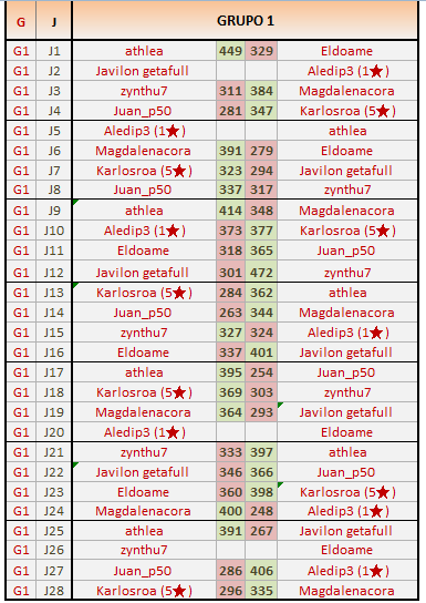 Deja un comentarioEn está página se irán publicando los resultados de las diferentes partidas, siendo ambos jugadores los responsables de subirlos, o comprobando que ya hayan sido subidos, insertando un COMENTARIO en la parte inferior de la pantalla (opción «Deja tu comentario«), indicando el nombre de los dos jugadores y los puntos obtenidos en la partida.