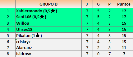 Deja un comentarioEn está página se irán publicando los resultados de las diferentes partidas, siendo ambos jugadores los responsables de subirlos, o comprobando que ya hayan sido subidos, insertando un COMENTARIO en la parte inferior de la pantalla (opción «Deja tu comentario«), indicando el nombre de los dos jugadores y los puntos obtenidos en la partida.