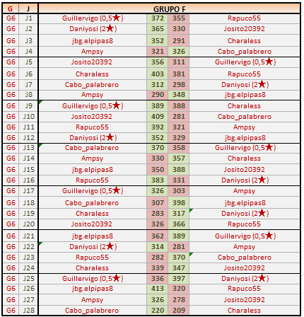 En está página se irán publicando los resultados de las diferentes partidas, siendo ambos jugadores los responsables de subirlos, o comprobando que ya hayan sido subidos, insertando un COMENTARIO en la parte inferior de la pantalla (opción «Deja tu comentario«), indicando el nombre de los dos jugadores y los puntos obtenidos en la partida.