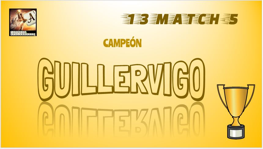 Felicidades al campeon, Guillervigo, esta con una racha muy buena. Nuestra segunda partida ha sido de mucha estrategia final pero estaba muy por debajo con las letras que tenia y el se la ha llevado. Esta vez me conformo con la medalla de cobre jeje. Estoy contento de llegar hasta aqui, todos sabemos que no es facil. Un placer jugar con todos vosotros.