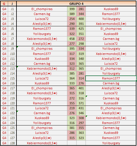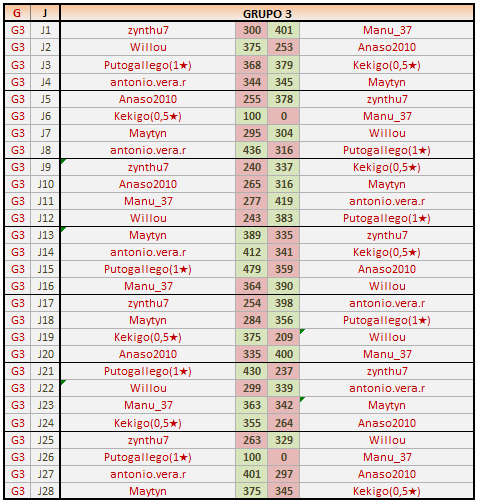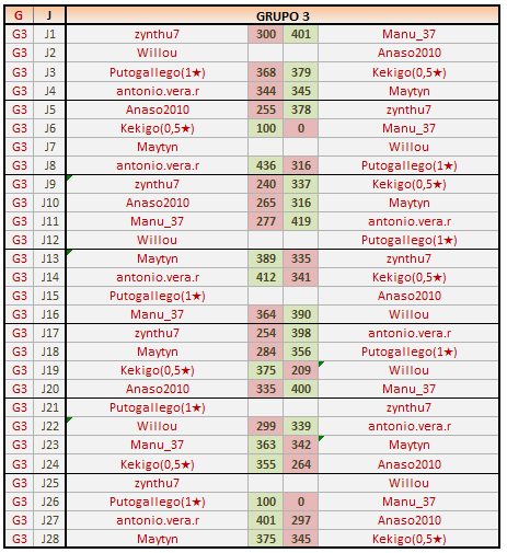Deja un comentarioEn está página se irán publicando los resultados de las diferentes partidas, siendo ambos jugadores los responsables de subirlos, o comprobando que ya hayan sido subidos, insertando un COMENTARIO en la parte inferior de la pantalla (opción “Deja tu comentario“), indicando el nombre de los dos jugadores y los puntos obtenidos en la partida.