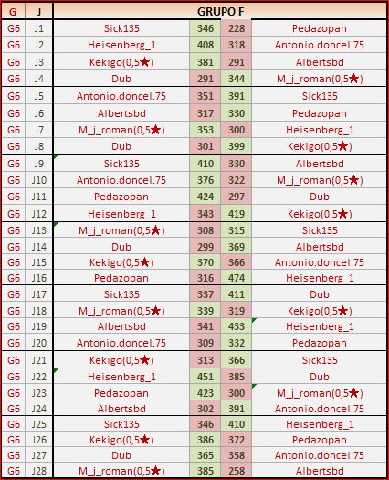 Deja un comentarioEn está página se irán publicando los resultados de las diferentes partidas, siendo ambos jugadores los responsables de subirlos, o comprobando que ya hayan sido subidos, insertando un COMENTARIO en la parte inferior de la pantalla (opción “Deja tu comentario“), indicando el nombre de los dos jugadores y los puntos obtenidos en la partida.