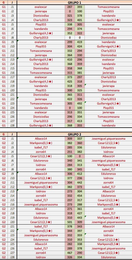 Deja un comentarioEn está página se irán publicando los resultados de las diferentes partidas, siendo ambos jugadores los responsables de subirlos, o comprobando que ya hayan sido subidos, insertando un COMENTARIO en la parte inferior de la pantalla (opción “Deja tu comentario“), indicando el nombre de los dos jugadores y los puntos obtenidos en la partida.