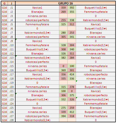 Deja un comentarioEn está página se irán publicando los resultados de las diferentes partidas, siendo ambos jugadores los responsables de subirlos, o comprobando que ya hayan sido subidos, insertando un COMENTARIO en la parte inferior de la pantalla (opción “Deja tu comentario“), indicando el nombre de los dos jugadores y los puntos obtenidos en la partida.