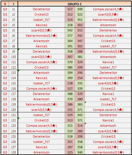 Deja un comentarioEn está página se irán publicando los resultados de las diferentes partidas, siendo ambos jugadores los responsables de subirlos, o comprobando que ya hayan sido subidos, insertando un COMENTARIO en la parte inferior de la pantalla (opción “Deja tu comentario“), indicando el nombre de los dos jugadores y los puntos obtenidos en la partida.