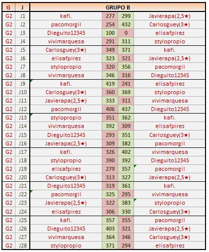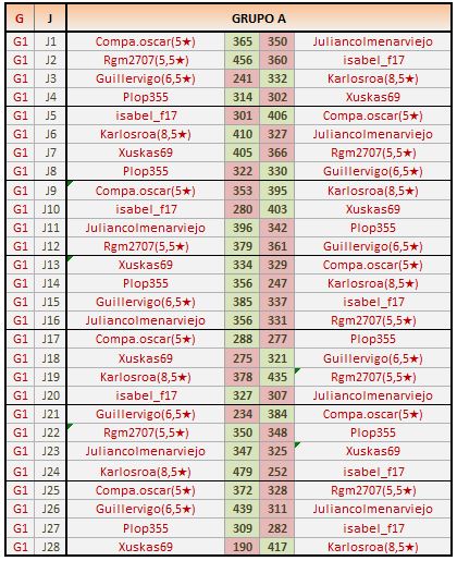 Deja un comentarioEn está página se irán publicando los resultados de las diferentes partidas, siendo ambos jugadores los responsables de subirlos, o comprobando que ya hayan sido subidos, insertando un COMENTARIO en la parte inferior de la pantalla (opción “Deja tu comentario“), indicando el nombre de los dos jugadores y los puntos obtenidos en la partida.
