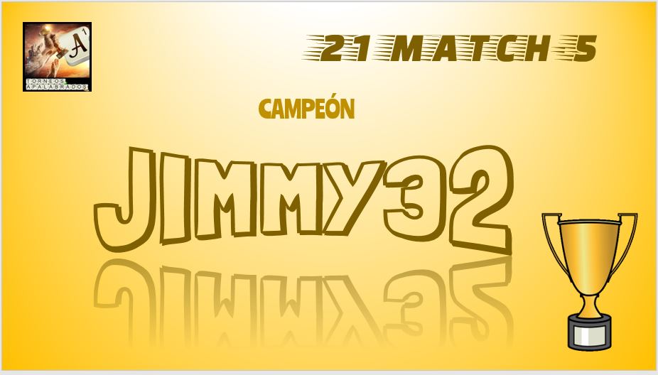 Felicidades Jimmy32!! Muy buen torneo 😉 Perdona por la tardanza en poner las últimas letras. No había pensado nunca tanto a la hora de hacer las últimas jugadas. . He intentado ganarte por todos los medios porque ahí estaba la diferencia entre poder ganar el torneo o quedar cuarto, así que eso le da más valor aún si cabe a tu victoria jaja.
