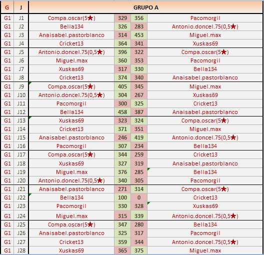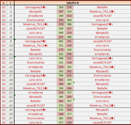 Deja un comentarioEn está página se irán publicando los resultados de las diferentes partidas, siendo ambos jugadores los responsables de subirlos, o comprobando que ya hayan sido subidos, insertando un COMENTARIO en la parte inferior de la pantalla (opción “Deja tu comentario“), indicando el nombre de los dos jugadores y los puntos obtenidos en la partida.