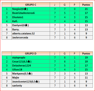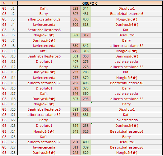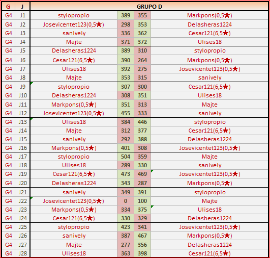 Deja un comentarioEn está página se irán publicando los resultados de las diferentes partidas, siendo ambos jugadores los responsables de subirlos, o comprobando que ya hayan sido subidos, insertando un COMENTARIO en la parte inferior de la pantalla (opción “Deja tu comentario“), indicando el nombre de los dos jugadores y los puntos obtenidos en la partida.