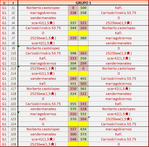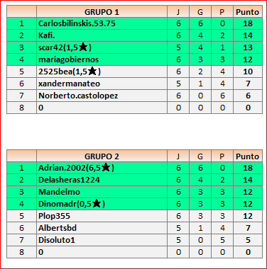 Deja un comentarioEn está página se irán publicando los resultados de las diferentes partidas, siendo ambos jugadores los responsables de subirlos, o comprobando que ya hayan sido subidos, insertando un COMENTARIO en la parte inferior de la pantalla (opción “Deja tu comentario“), indicando el nombre de los dos jugadores y los puntos obtenidos en la partida.