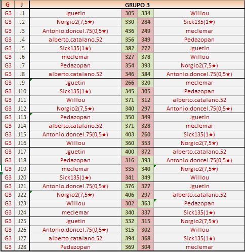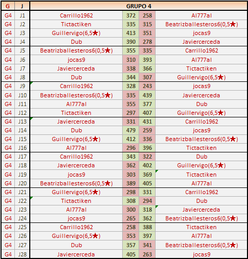 Deja un comentarioEn está página se irán publicando los resultados de las diferentes partidas, siendo ambos jugadores los responsables de subirlos, o comprobando que ya hayan sido subidos, insertando un COMENTARIO en la parte inferior de la pantalla (opción “Deja tu comentario“), indicando el nombre de los dos jugadores y los puntos obtenidos en la partida.