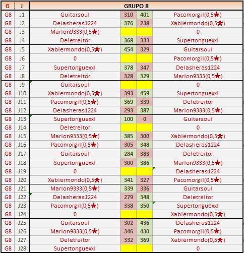 Deja un comentarioEn está página se irán publicando los resultados de las diferentes partidas, siendo ambos jugadores los responsables de subirlos, o comprobando que ya hayan sido subidos, insertando un COMENTARIO en la parte inferior de la pantalla (opción “Deja tu comentario“), indicando el nombre de los dos jugadores y los puntos obtenidos en la partida.