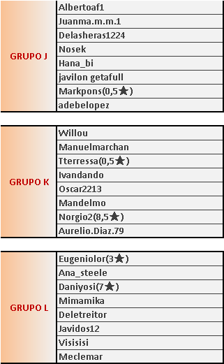 Buenas, mañana 27/01/2017 comienza la nueva fase, estoy en el Grupo I, es probable que mañana comience las que me toca comenzar, pero no volveré a jugar hasta el miércoles de la próxima semana, debido a que saldre de viaje y donde voy a estar no hay internet, aquellas donde la otra persona le toque comenzar sino lo hace temprano no aceptare la partida hasta que regrese.