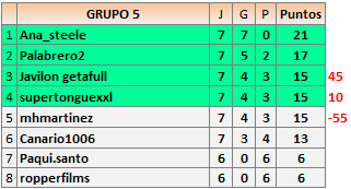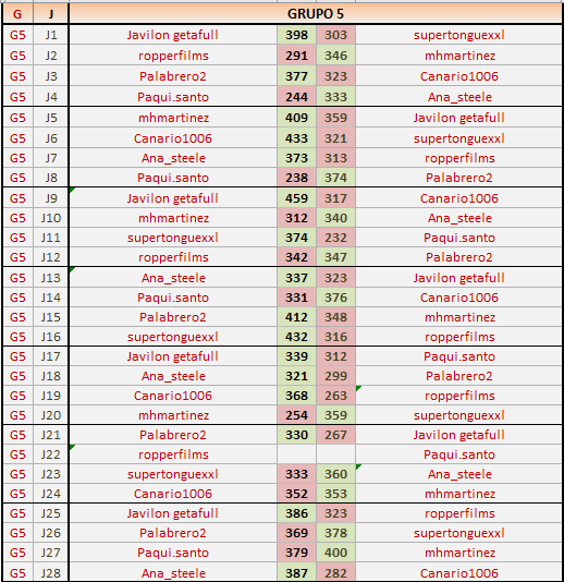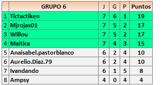 Deja un comentarioEn está página se irán publicando los resultados de las diferentes partidas, siendo ambos jugadores los responsables de subirlos, o comprobando que ya hayan sido subidos, insertando un COMENTARIO en la parte inferior de la pantalla (opción «Deja tu comentario»), indicando el nombre de los dos jugadores y los puntos obtenidos en la partida.