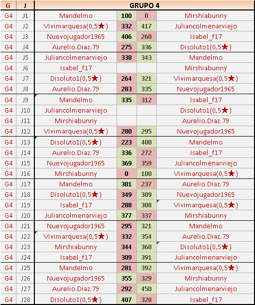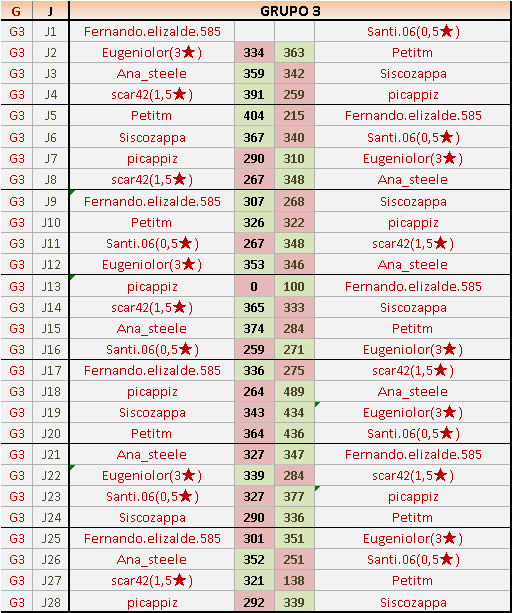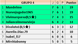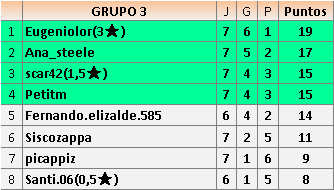 Deja un comentarioEn está página se irán publicando los resultados de las diferentes partidas, siendo ambos jugadores responsables de subirlos o de comprobar que ya hayan sido publicados insertando un COMENTARIO en la parte inferior de la pantalla (opción “Deja tu comentario”), indicando el nombre de los dos jugadores y los puntos obtenidos en la partida.