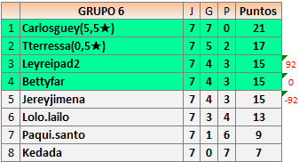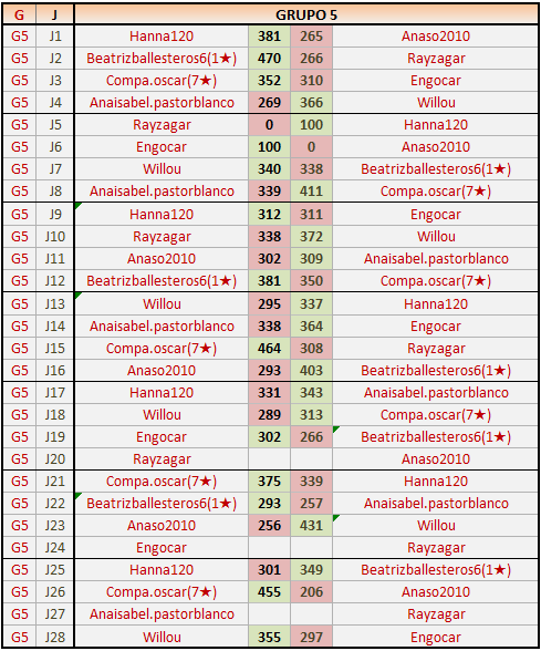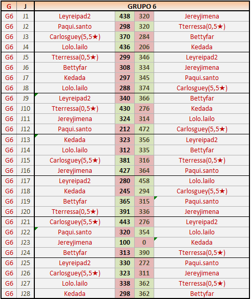 Deja un comentarioEn está página se irán publicando los resultados de las diferentes partidas, siendo ambos jugadores responsables de subirlos o de comprobar que ya hayan sido publicados insertando un COMENTARIO en la parte inferior de la pantalla (opción “Deja tu comentario”), indicando el nombre de los dos jugadores y los puntos obtenidos en la partida.