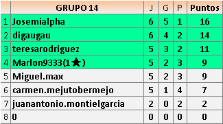 Deja un comentarioEn está página se irán publicando los resultados de las diferentes partidas, siendo ambos jugadores responsables de subirlos o de comprobar que ya hayan sido publicados insertando un COMENTARIO en la parte inferior de la pantalla (opción “Deja tu comentario”), indicando el nombre de los dos jugadores y los puntos obtenidos en la partida.