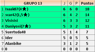 Deja un comentarioEn está página se irán publicando los resultados de las diferentes partidas, siendo ambos jugadores responsables de subirlos o de comprobar que ya hayan sido publicados insertando un COMENTARIO en la parte inferior de la pantalla (opción “Deja tu comentario”), indicando el nombre de los dos jugadores y los puntos obtenidos en la partida.