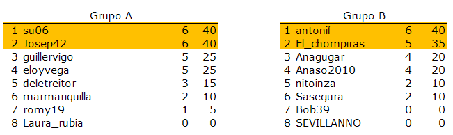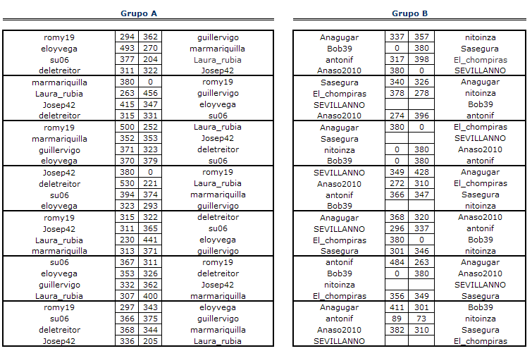 Deja un comentarioEn está página se irán indicando los resultados de las diferentes partidas. Lo único que tienes que hacer es insertar un comentario en la parte inferior de la pantalla (“Deja tu comentario”) indicando el nombre de los dos usuarios y los puntos obtenidos por ambos en la partida. El vencedor de cada partida será el encargado de comunicar el resultado en este apartado.