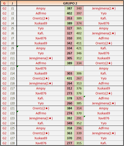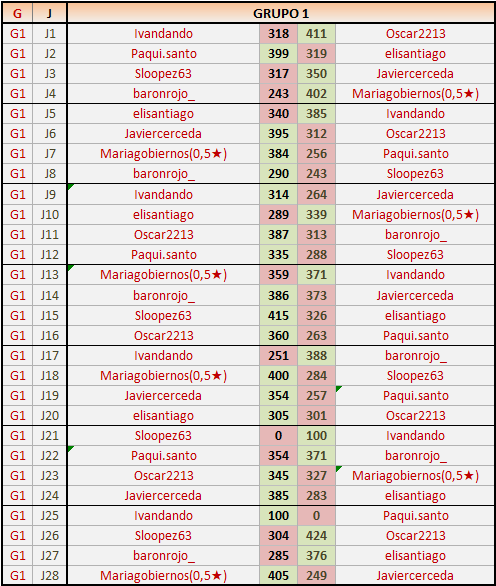 Deja un comentarioEn está página se irán publicando los resultados de las diferentes partidas, siendo ambos jugadores responsables de subirlos o de comprobar que ya hayan sido publicados insertando un COMENTARIO en la parte inferior de la pantalla (opción “Deja tu comentario”), indicando el nombre de los dos jugadores y los puntos obtenidos en la partida.