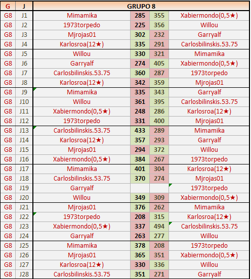 Deja un comentarioEn está página se irán publicando los resultados de las diferentes partidas, siendo ambos jugadores responsables de subirlos o de comprobar que ya hayan sido publicados insertando un COMENTARIO en la parte inferior de la pantalla (opción “Deja tu comentario”), indicando el nombre de los dos jugadores y los puntos obtenidos en la partida.