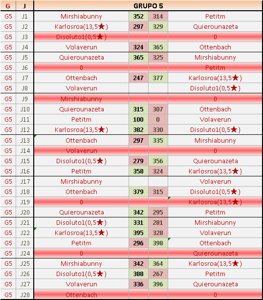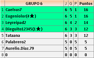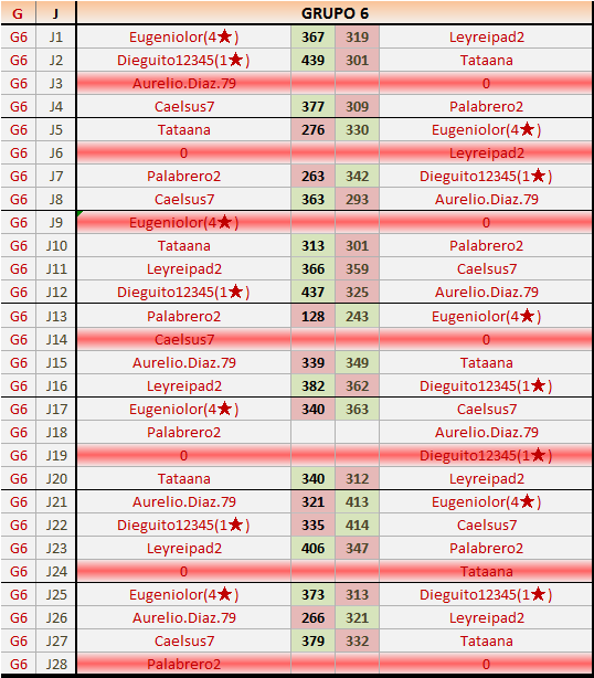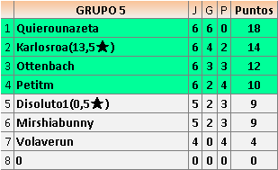 Deja un comentarioEn está página se irán publicando los resultados de las diferentes partidas, siendo ambos jugadores responsables de subirlos o de comprobar que ya hayan sido publicados insertando un COMENTARIO en la parte inferior de la pantalla (opción “Deja tu comentario”), indicando el nombre de los dos jugadores y los puntos obtenidos en la partida.