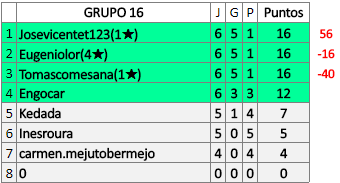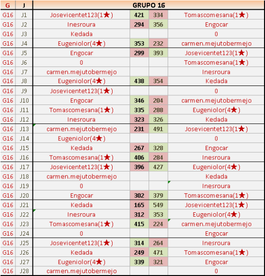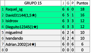 Deja un comentarioEn está página se irán publicando los resultados de las diferentes partidas, siendo ambos jugadores responsables de subirlos o de comprobar que ya hayan sido publicados insertando un COMENTARIO en la parte inferior de la pantalla (opción “Deja tu comentario”), indicando el nombre de los dos jugadores y los puntos obtenidos en la partida.