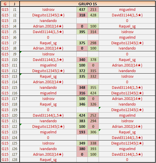 Deja un comentarioEn está página se irán publicando los resultados de las diferentes partidas, siendo ambos jugadores responsables de subirlos o de comprobar que ya hayan sido publicados insertando un COMENTARIO en la parte inferior de la pantalla (opción “Deja tu comentario”), indicando el nombre de los dos jugadores y los puntos obtenidos en la partida.