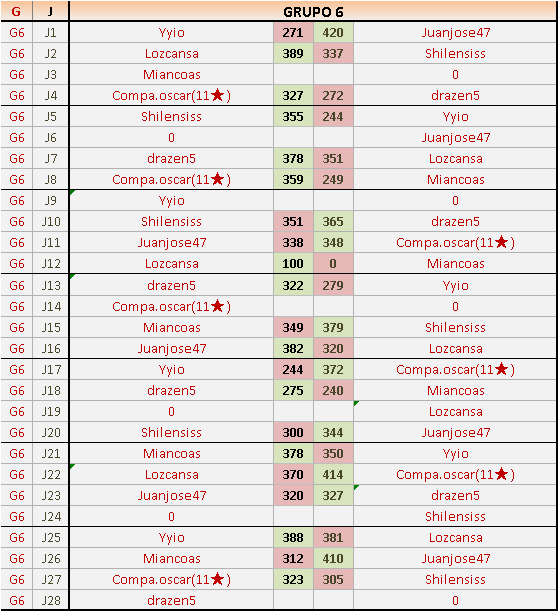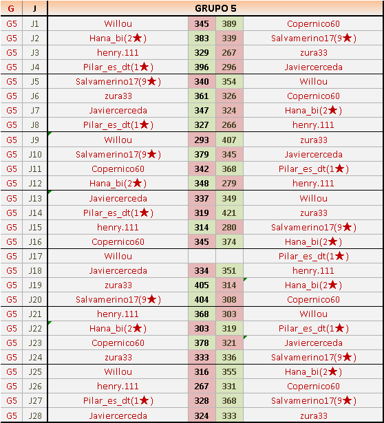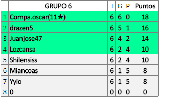 Deja un comentarioEn está página se irán publicando los resultados de las diferentes partidas, siendo ambos jugadores responsables de subirlos o de comprobar que ya hayan sido publicados insertando un COMENTARIO en la parte inferior de la pantalla (opción “Deja tu comentario”), indicando el nombre de los dos jugadores y los puntos obtenidos en la partida.