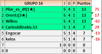 Deja un comentarioEn está página se irán publicando los resultados de las diferentes partidas, siendo ambos jugadores responsables de subirlos o de comprobar que ya hayan sido publicados insertando un COMENTARIO en la parte inferior de la pantalla (opción “Deja tu comentario”), indicando el nombre de los dos jugadores y los puntos obtenidos en la partida.