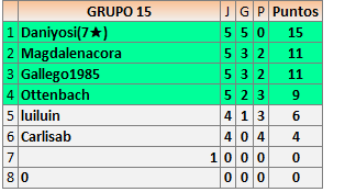 Deja un comentarioEn está página se irán publicando los resultados de las diferentes partidas, siendo ambos jugadores responsables de subirlos o de comprobar que ya hayan sido publicados insertando un COMENTARIO en la parte inferior de la pantalla (opción “Deja tu comentario”), indicando el nombre de los dos jugadores y los puntos obtenidos en la partida.