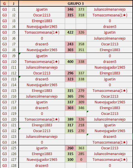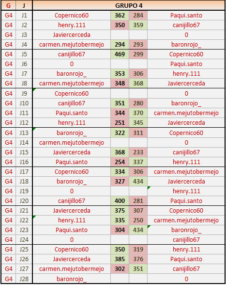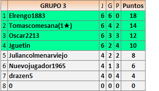 Deja un comentarioEn está página se irán publicando los resultados de las diferentes partidas, siendo ambos jugadores responsables de subirlos o de comprobar que ya hayan sido publicados insertando un COMENTARIO en la parte inferior de la pantalla (opción “Deja tu comentario”), indicando el nombre de los dos jugadores y los puntos obtenidos en la partida.