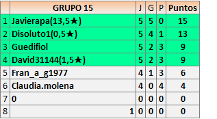 Deja un comentarioEn está página se irán publicando los resultados de las diferentes partidas, siendo ambos jugadores responsables de subirlos o de comprobar que ya hayan sido publicados insertando un COMENTARIO en la parte inferior de la pantalla (opción “Deja tu comentario”), indicando el nombre de los dos jugadores y los puntos obtenidos en la partida.