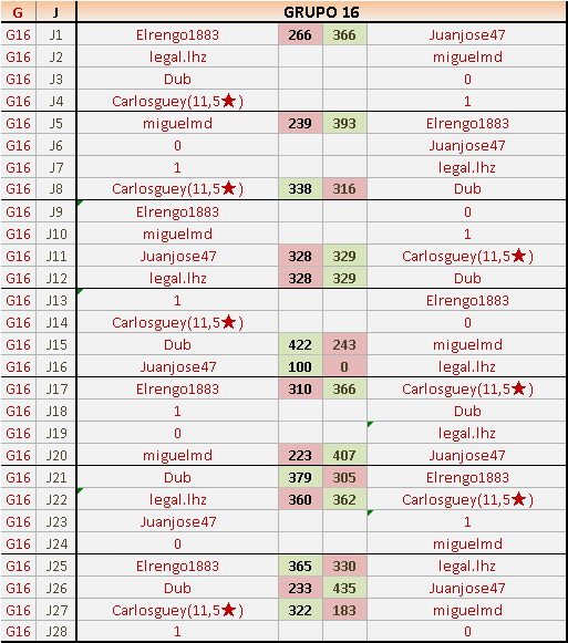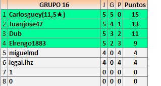Deja un comentarioEn está página se irán publicando los resultados de las diferentes partidas, siendo ambos jugadores responsables de subirlos o de comprobar que ya hayan sido publicados insertando un COMENTARIO en la parte inferior de la pantalla (opción “Deja tu comentario”), indicando el nombre de los dos jugadores y los puntos obtenidos en la partida.