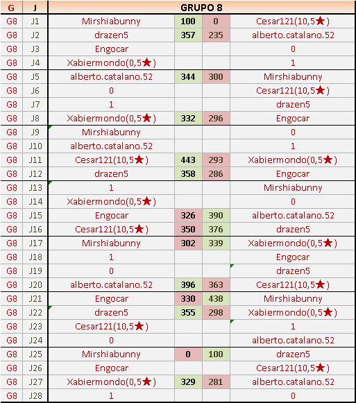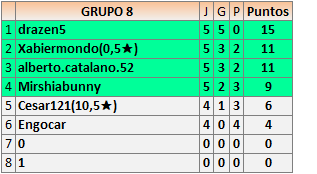 Deja un comentarioEn está página se irán publicando los resultados de las diferentes partidas, siendo ambos jugadores responsables de subirlos o de comprobar que ya hayan sido publicados insertando un COMENTARIO en la parte inferior de la pantalla (opción “Deja tu comentario”), indicando el nombre de los dos jugadores y los puntos obtenidos en la partida.