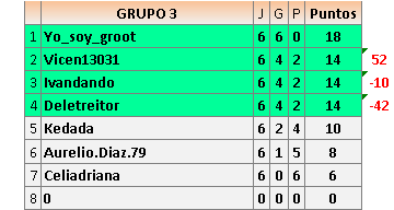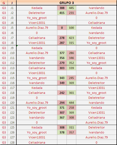 Deja un comentarioEn está página se irán publicando los resultados de las diferentes partidas, siendo ambos jugadores responsables de subirlos o de comprobar que ya hayan sido publicados insertando un COMENTARIO en la parte inferior de la pantalla (opción “Deja tu comentario”), indicando el nombre de los dos jugadores y los puntos obtenidos en la partida.