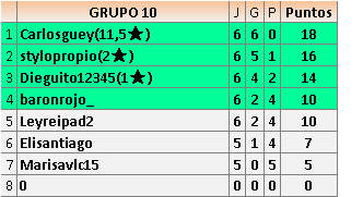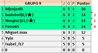 Deja un comentarioEn está página se irán publicando los resultados de las diferentes partidas, siendo ambos jugadores responsables de subirlos o de comprobar que ya hayan sido publicados insertando un COMENTARIO en la parte inferior de la pantalla (opción “Deja tu comentario”), indicando el nombre de los dos jugadores y los puntos obtenidos en la partida.